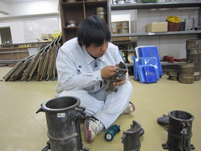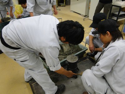 土木系学科である測量設計科2年の学生がコンクリートの圧縮強度試験用テストピースを作成しました。