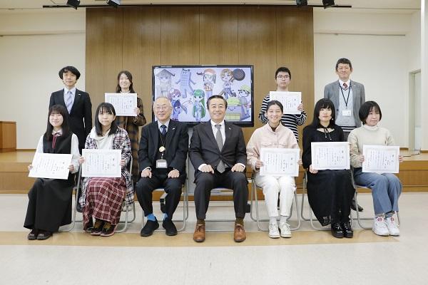 姉妹校の「あいち造形デザイン専門学校」コミックアートコースの学生協力により、本校設置学科のキャラクターが決定しました。応募総数約50作品の中から選ばれた、学科をイメージしたかわいいキャラクターたちです。表彰式では、本校の野村校長より賞状と記念品を贈呈させていただきました。あいち造形デザイン専門学校の学生さんたちも喜んでくれていた様子でよかったです。完成したキャラクターは、オープンキャンパスに来ると出会えるかも!?