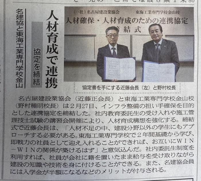 2月27日(木)、一般社団法人名古屋建設業協会と東海工業専門学校金山校は、建設業務の発展および人材確保・育成を目的とした連携協定を締結しました。この協定の締結については、建通新聞に掲載されました。